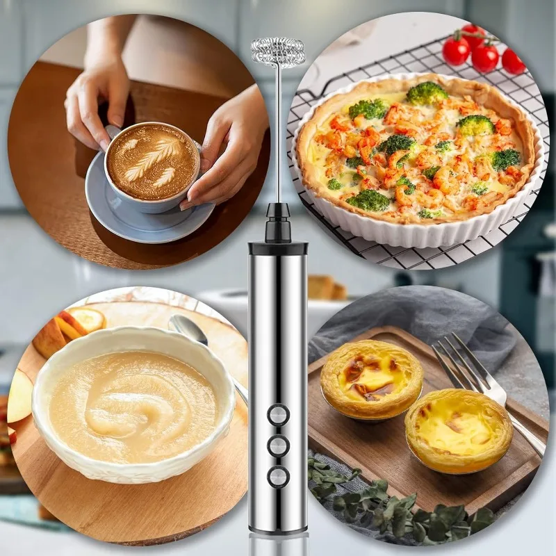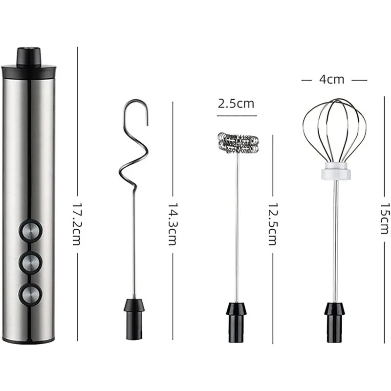 3-in-1 Milk Frother - Our multifunctional electric milk frother has 3 interchangeable heads: an egg whisk, a milk frother, a mixer. The 3 head can help you beat eggs and cream, make milk and coffee foam, enjoy the jam making process and baby food.
