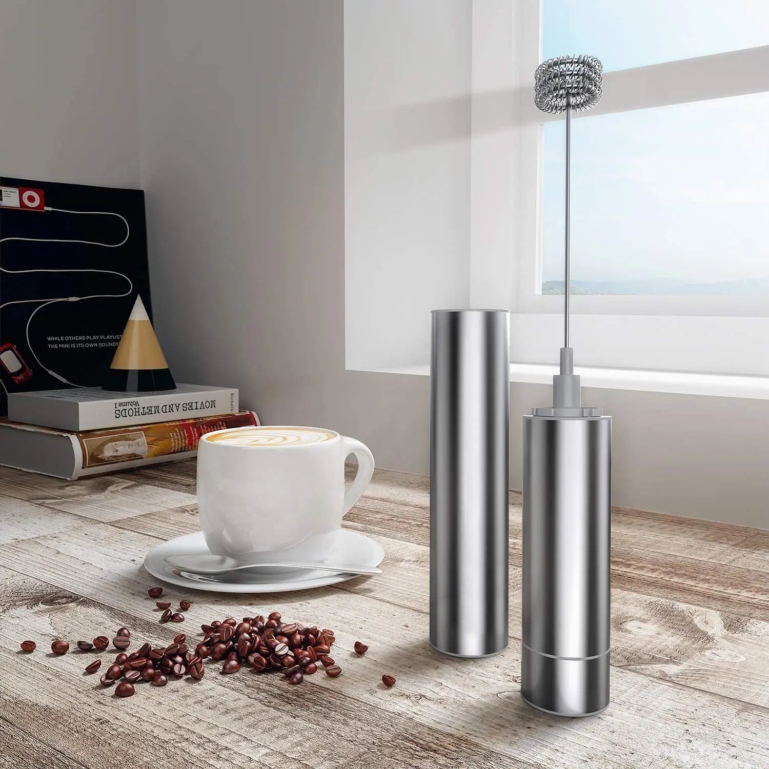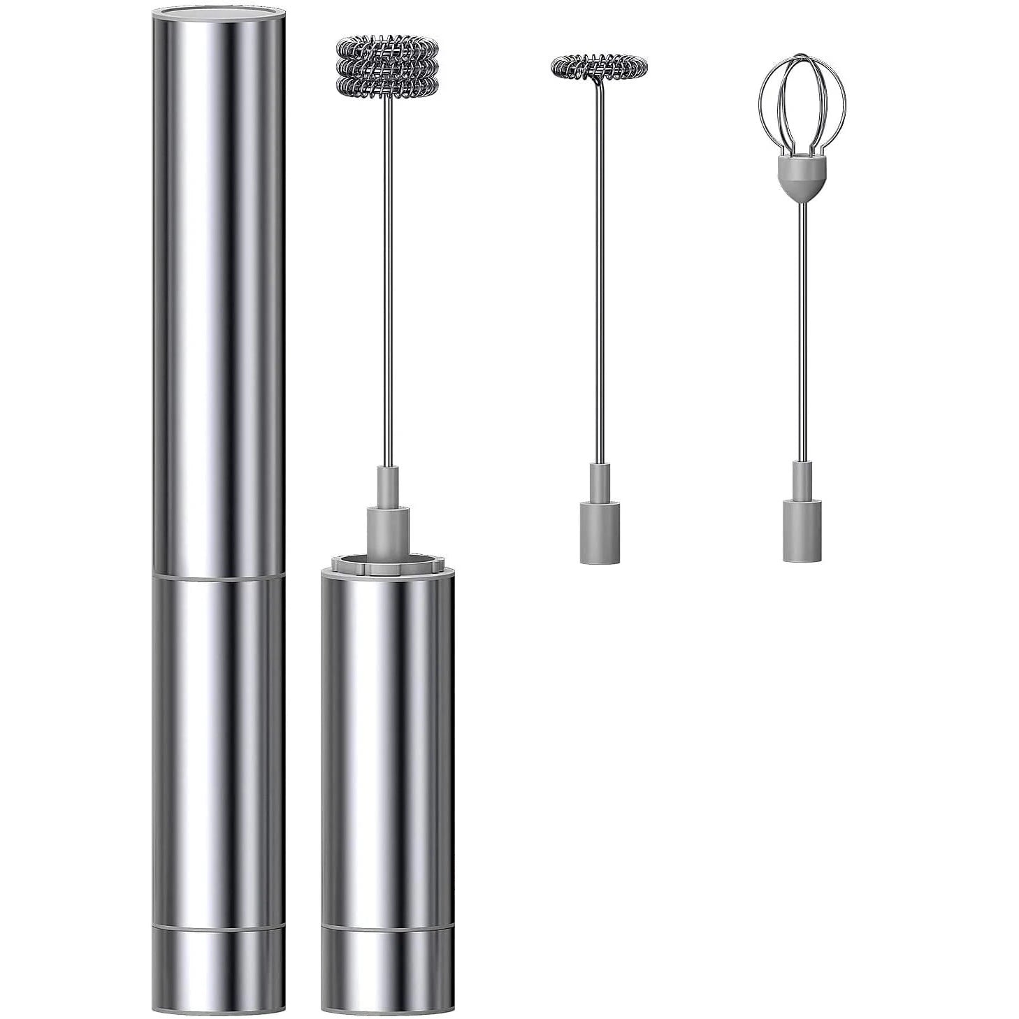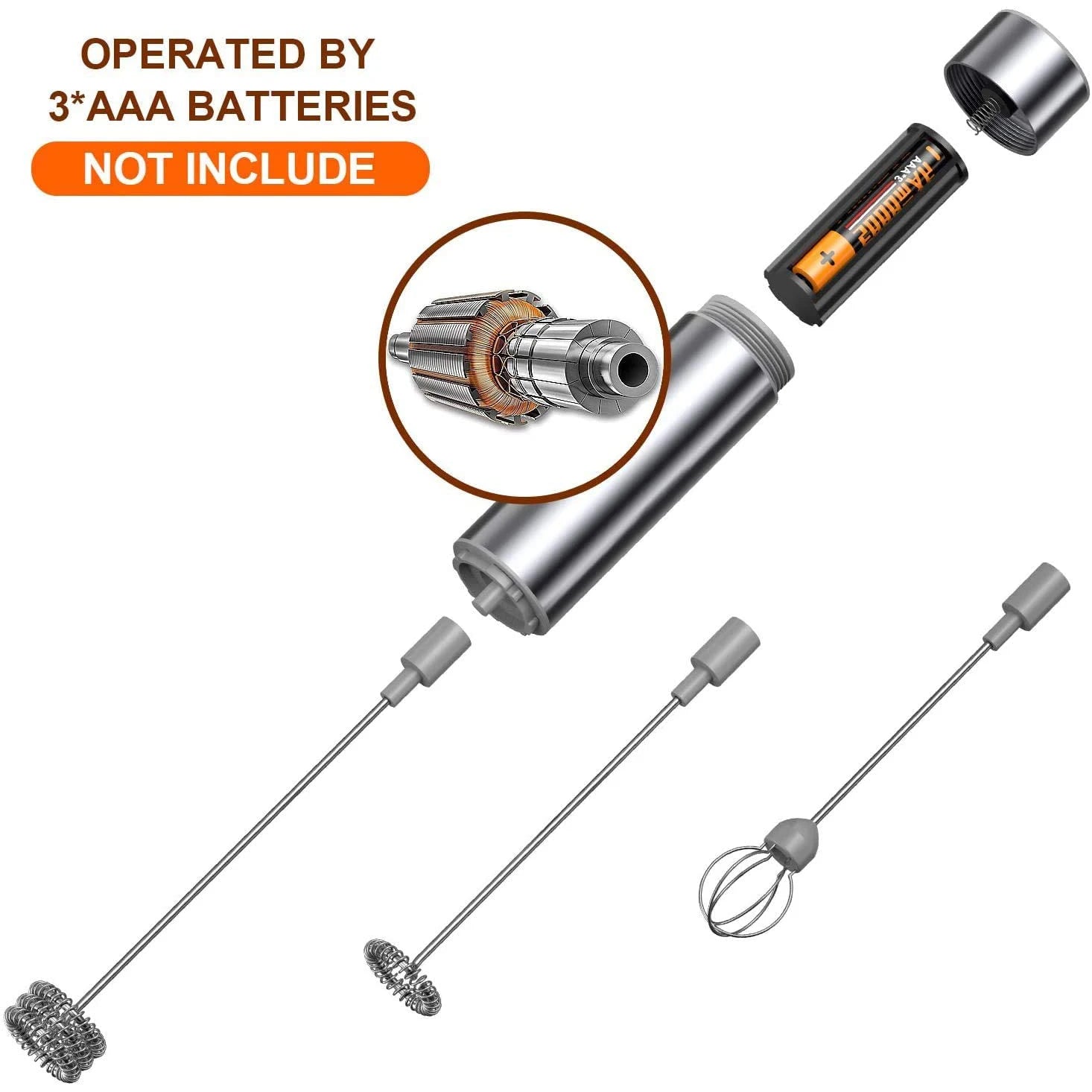 [Durable and Safe]-Electric handheld coffee frother is made of food grade stainless steel, it won't rust, delivers double the power of other frothers. [Easy to Clean and Store]-After use this milk frother, just put the whisk in running water and briefly turn it on - instantly clean! [Three Layers of Whisk]-Three layers are different from others, double the power of other frothers and professional espresso makers available.you can spend less time and can create thicker foam. [Easy to Use]-Simple one-touch switch with a powerful motor but it has low noise level. Just put it into a container with liquid food up to approx 1/3 to froth. Battery operated and 3 AAA batteries (excluded) Product Name: Milk Frother Electric Colour: silver Material: ABS+stainless steel Size: 3.2 x 23.9cm Package Contents: 1 x agitator host 1 x sleeve 3 x different mixing heads Only the above package content, other products are not included. Note: Light shooting and different displays may cause the color of the item in the picture a little different from the real thing. The measurement allowed error is +/- 1-3cm.