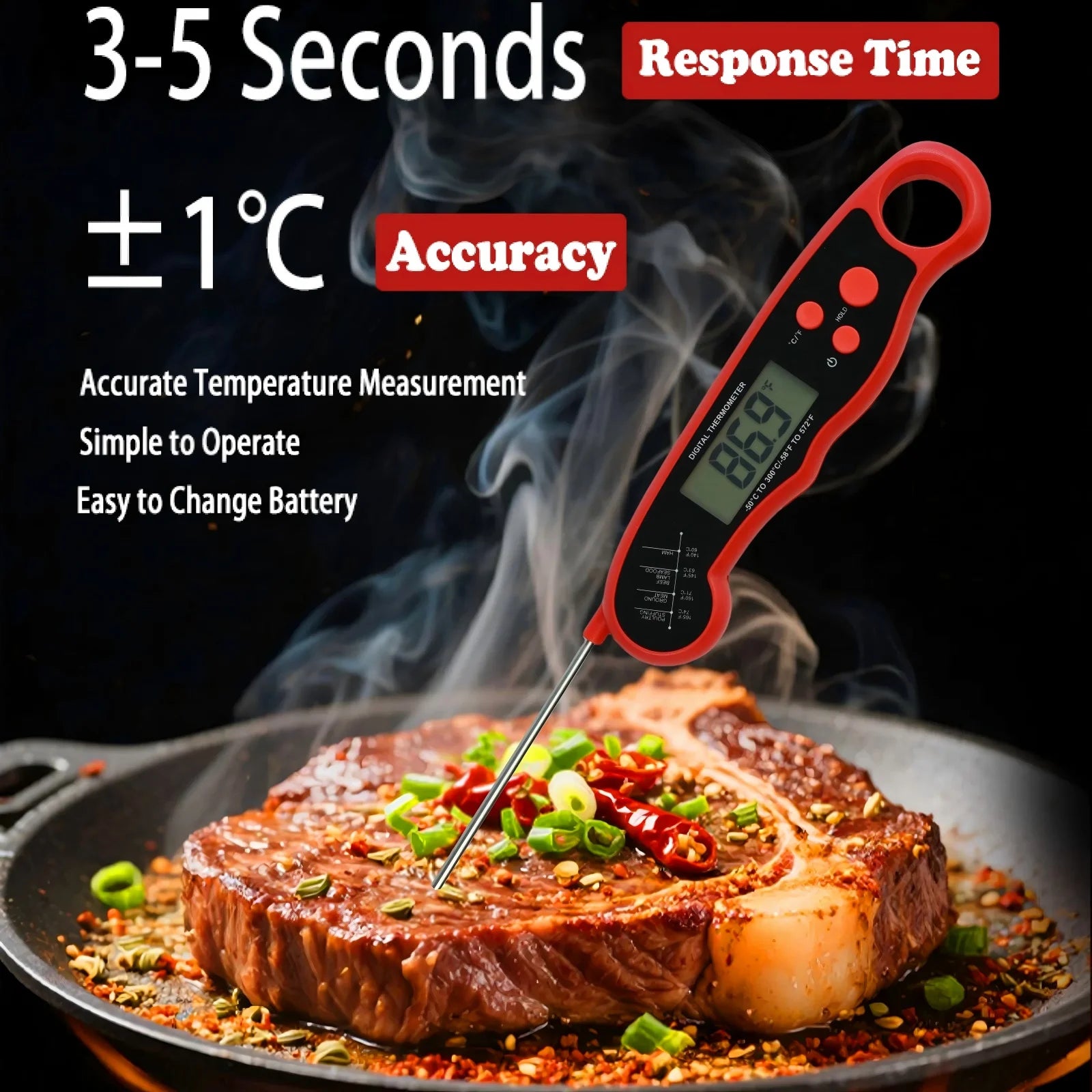 It can easily detect the temperature of food. You only need to wait for 2-3 seconds to obtain the accurate temperature of the food. Meanwhile, the food thermometer can switch between Celsius and Fahrenheit by simply clicking the "℃"/"℉ CAL" button. The temperature range is -50 ℃ to 300 ℃ (-58 ℉ to 572 ℃ ℉), suitable for turkey, steak, and candy. Production, outdoor barbecue, etc.